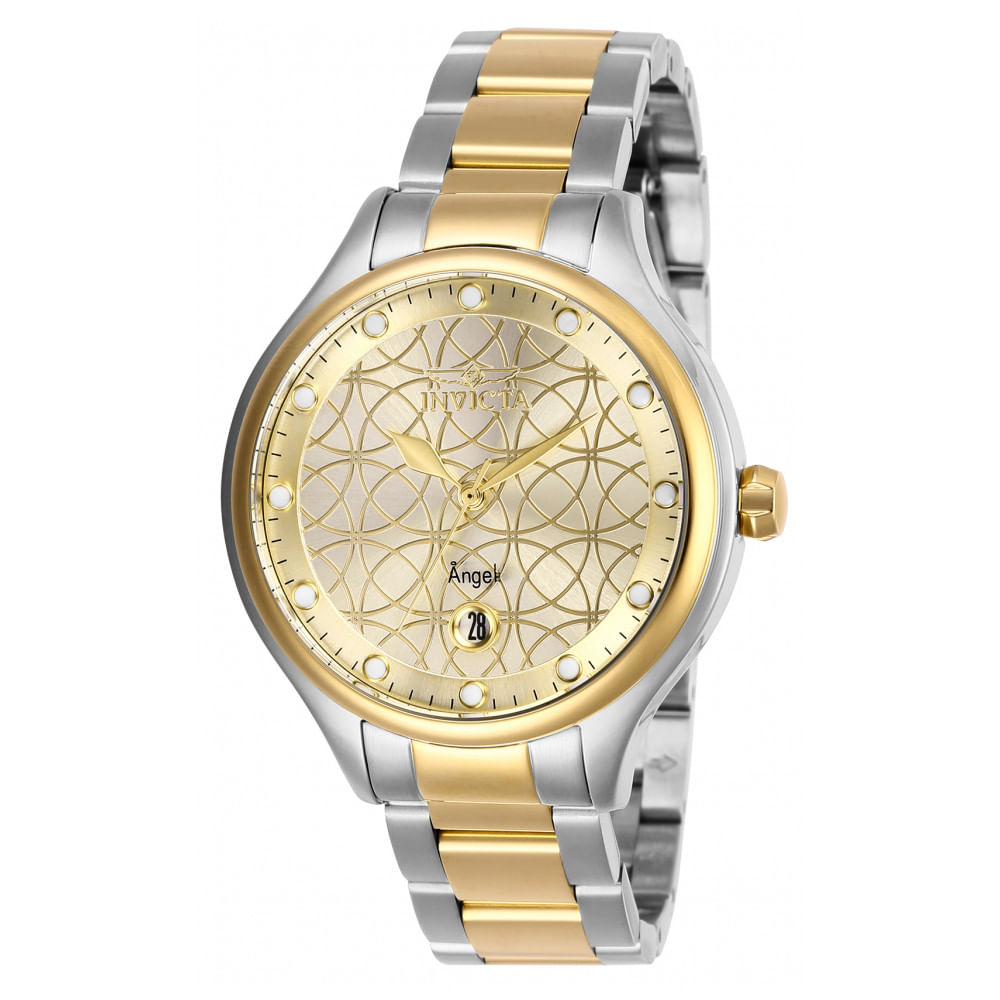 Atenção: Todos os produtos elétricos são 110V e necessitam de adaptador para a tomada no formato Brasileiro. Este atraente relógio Invicta da coleção Angel é movido por um movimento Quartz preciso, com caixa de aço. Seu mostrador é decorado por um mostrador de metal dourado e protegido por um resistente Flame Fusion Crystal. Uma pulseira de aço, ouro e aço inoxidável completa este relógio que pode resistir à água por até 100 m.