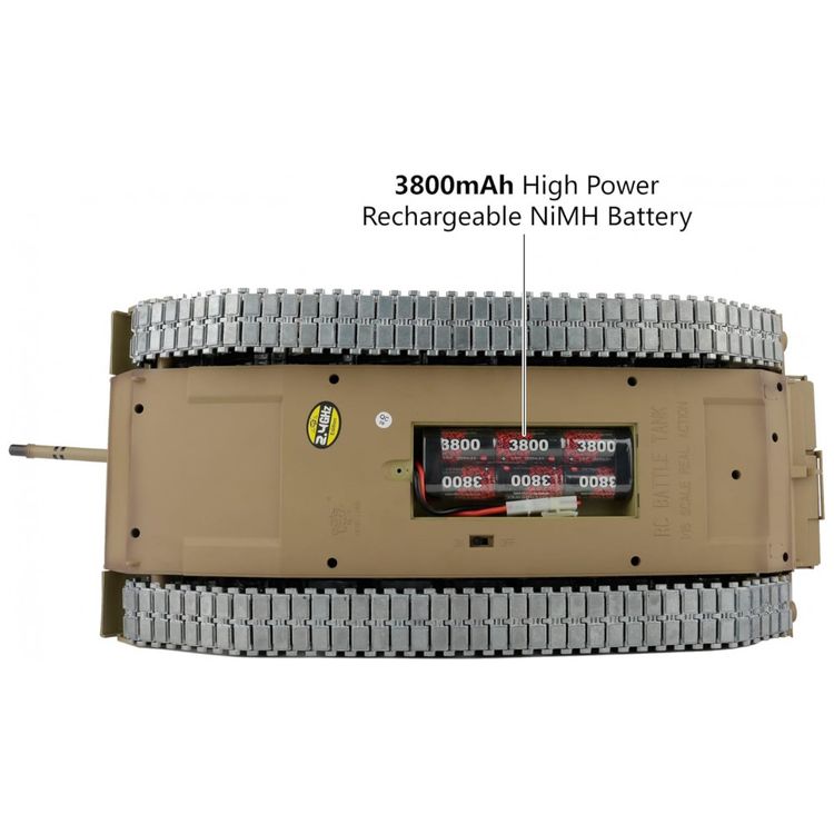Atenção: Todos os produtos elétricos são 110V e necessitam de adaptador para a tomada no formato Brasileiro. Este tanque é equipado com uma caixa de engrenagens de aço atualizada, que o torna mais resistente ao desgaste e aumenta sua vida útil. Os trilhos, roda dentada e roda ociosa são de metal, enquanto a roda de estrada, pneus e braços de suspensão são de plástico padrão. A torre giratória de 360 graus foi modificada para permitir a rotação para a esquerda e direita, com anéis deslizantes elétricos feitos à mão e instalados no tanque. Ele vem com uma bateria Nimh recarregável de alta potência de 3800mah modificada. O tanque é capaz de avançar, acelerar para frente e para trás, acelerar para trás e girar, além de ter o cano elevado em até 30 graus. A torre pode girar 360 graus e o ângulo da arma pode ser ajustado em até 30 graus. O tanque emite sons realistas do motor e do canhão, além de ter um simulador de efeitos de fumaça. Ele dispara BBs padrão de 6 mm como um tanque real e tem um efeito de recuo e som de disparo. O sistema eletrônico completo inclui controle remoto de fumaça e sistema de som, com controle de rádio de 2,4 GHz que suporta muitos tanques semelhantes lutando juntos sem interferência.