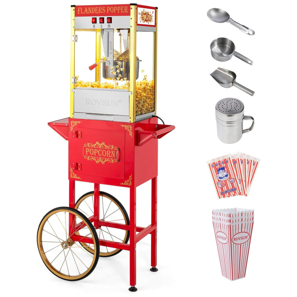 Máquina de Pipoca ROVSUN com Carrinho, Rodas e Panela de 280 g, faz até 15 L. Acompanha Concha de Aço Inox, Colher de Óleo, Sacos e 3 Copos.