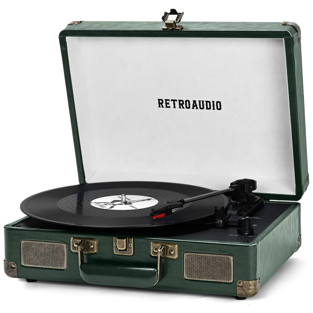 Atenção: Todos os produtos elétricos são 110V e necessitam de adaptador para a tomada no formato Brasileiro. Desfrute da autenticidade musical com o Toca-discos de Vinil Retro em maleta vintage. Com 3 velocidades (33 ⅓, 45, 78 RPM) e suporte para discos. Possui pés isolantes de som que evitam vibrações indesejadas. A maleta combina elementos retrô com design moderno, permitindo ouvir sua música em qualquer lugar. Conecte facilmente seus dispositivos favoritos via Bluetooth e desfrute do som através das duas caixas de som embutidas. Além disso, conta com saída RCA para conectar em sistemas de som externos. Perfeito para iniciantes e entusiastas de vinil. Ideal para presentear em diversas ocasiões. Especificações: Dimensões do produto: 33,3 x 25,4 x 10,2 centímetros, Peso do produto: 4 Quilogramas, Número do modelo: JM-101-Preto, Fabricante: RetroAudio, Tecnologia de conectividade: Bluetooth, RCA, Velocidade máxima de rotação: 78 RPM, Componentes incluídos: Cabo de energia, Toca-discos, Manual do usuário, Material: Madeira Engenheirada, Metal, Couro PU, Estilo: Retrô, Vintage, Cor: Verde Escuro, Nome do modelo: JM-101-Verde Escuro Voltagem:110 volts