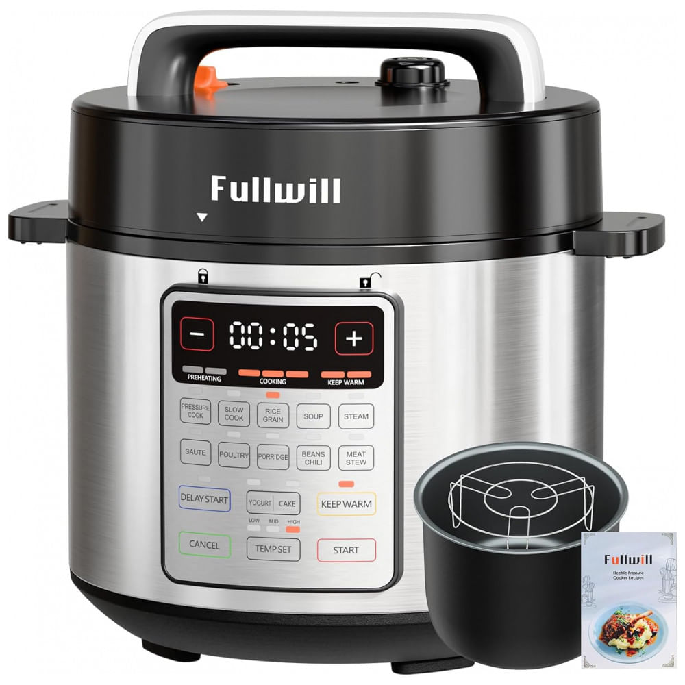Atenção: Todos os produtos elétricos são 110V e necessitam de adaptador para a tomada no formato Brasileiro. Simplifique sua cozinha e economize muito com a Panela de Pressão Fullwill 9 em 1! Esta potência substitui sua panela de pressão, panela elétrica, panela de arroz, iogurteira, fazedora de bolos, frigideira, vaporizador, aquecedor de alimentos e fabricante de sopas. Cozinhar sem esforço com 12 Programas Inteligentes que preparam refeições perfeitas com o toque de um botão! Escolha entre Cozimento Rápido, Cozimento Lento, Aves, Vapor, Mingau, Sopa, Feijão/Chili, Bolo, Carne/Ensopado, Arroz/Grãos, Refogar ou Iogurte. Limpeza fácil e culinária mais saudável com a panela interna durável antiaderente livre de PFOA, carcaça em aço inoxidável resistente a impressões digitais e acessórios laváveis na lava-louças. Prepare refeições instantâneas em uma única panela e tenha o jantar pronto até 70 mais rápido do que o método tradicional! Cozinhe com tranquilidade e segurança, com mais de 10 recursos de segurança embutidos, incluindo proteção contra superaquecimento, trava de segurança na tampa e controle de pressão. Manual detalhado e livro de receitas inclusos para facilitar o uso. Tamanho familiar de 6 litros, perfeito para 4-6 pessoas, refeições familiares ou preparação semanal. Cozinhe uma vez, sirva a todos. Especificações: Capacidade: 6 Litros, Material: Alumínio, Cor:Prata, Tipo de Acabamento: Brilhante, Dimensões do Produto: 33cm D x 33cm L x 35,5cm A, Característica Especial: Desligamento Automático, Lava-louças, Manter Aquecido, Tampa com Trava, Programável, Potência: 1000 watts, Peso do Item: 5,82 kg, Método de Controle: Toque, Modo de Operação: Automático, Voltagem:110 volts UPC: 850066761120, Programas de Cozimento: Cozinhar, Manter Aquecido, Cozinhar em Fogo Baixo, Vapor, Fabricante: Fullwill, Número do Modelo: UNIVCA